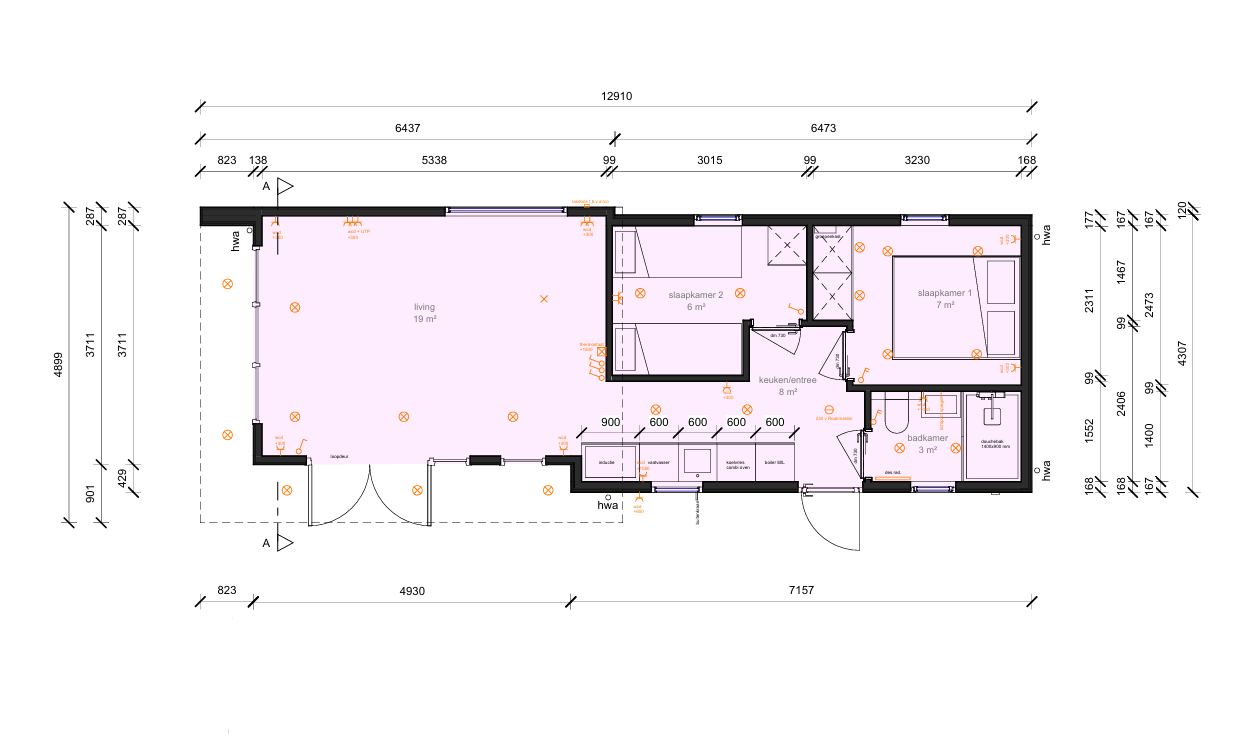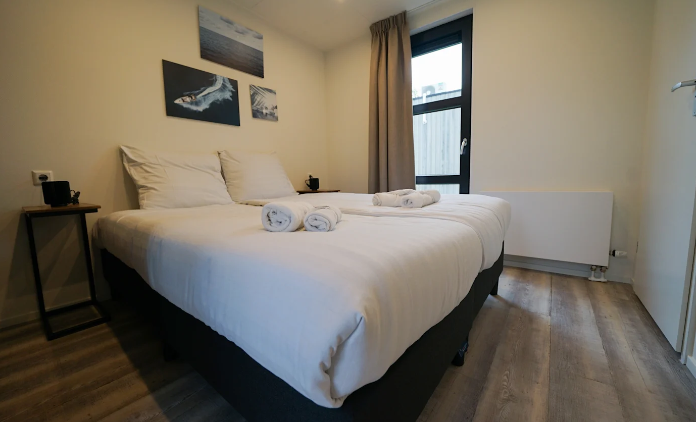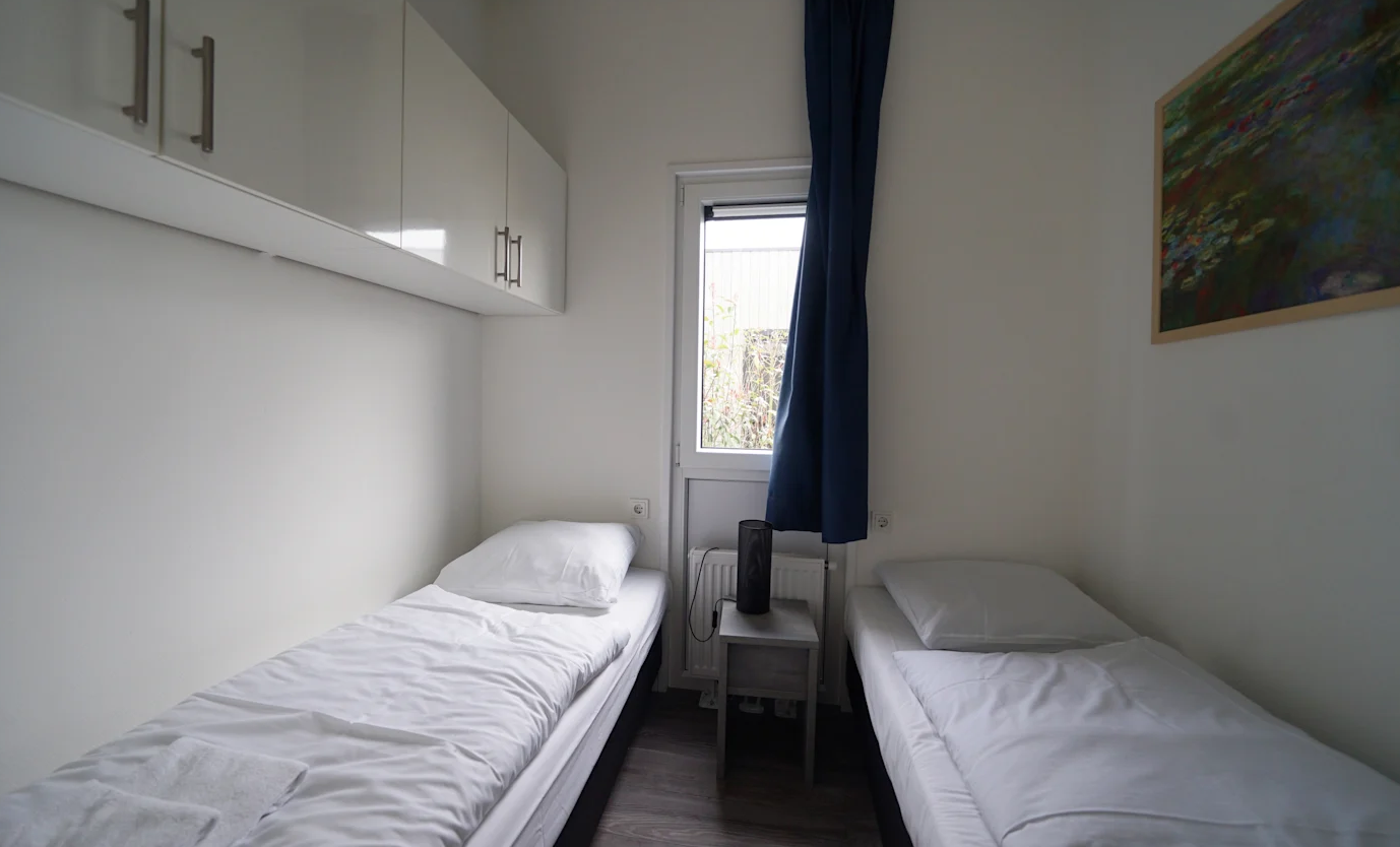 Trespo in badkamer, extra isolatie, rollerblinds in slaapkamers, ingericht met nachtkastjes en opbergkasten, PVC vloer, airco