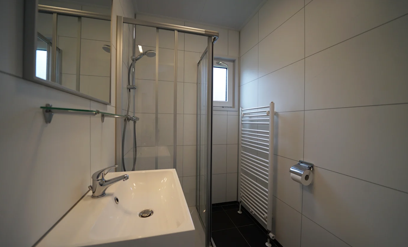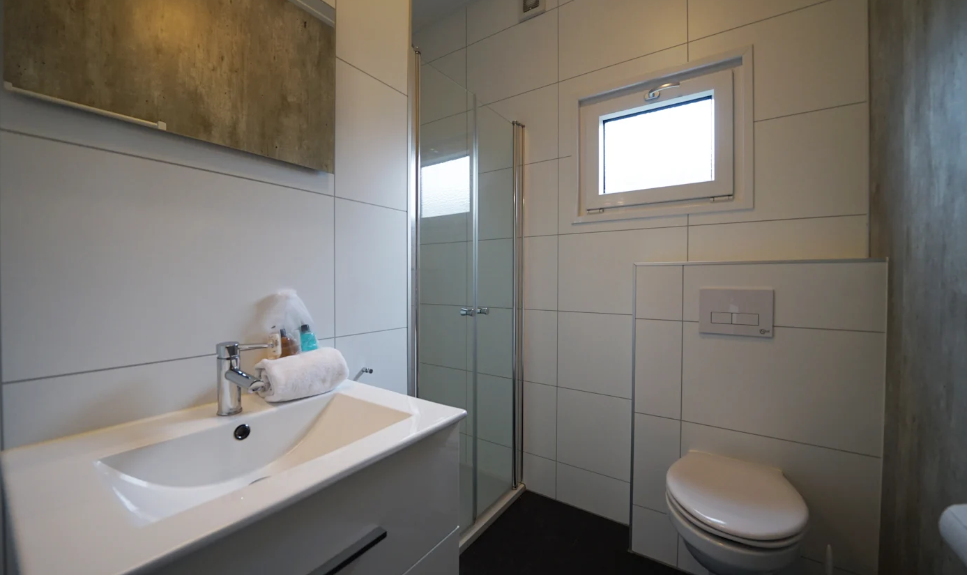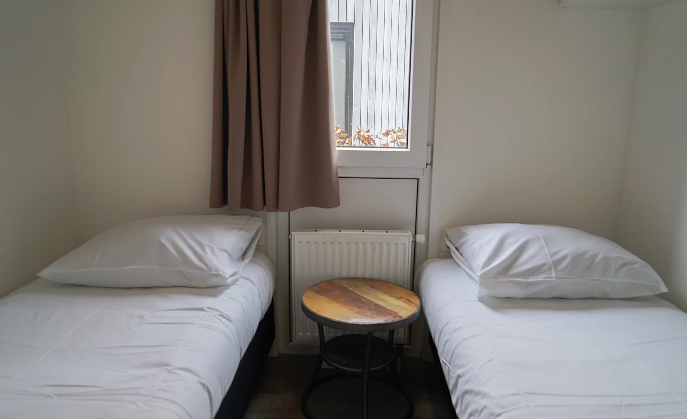 Modern chalet met plat dak, volledig ingericht interieur, PVC vloer en airco.