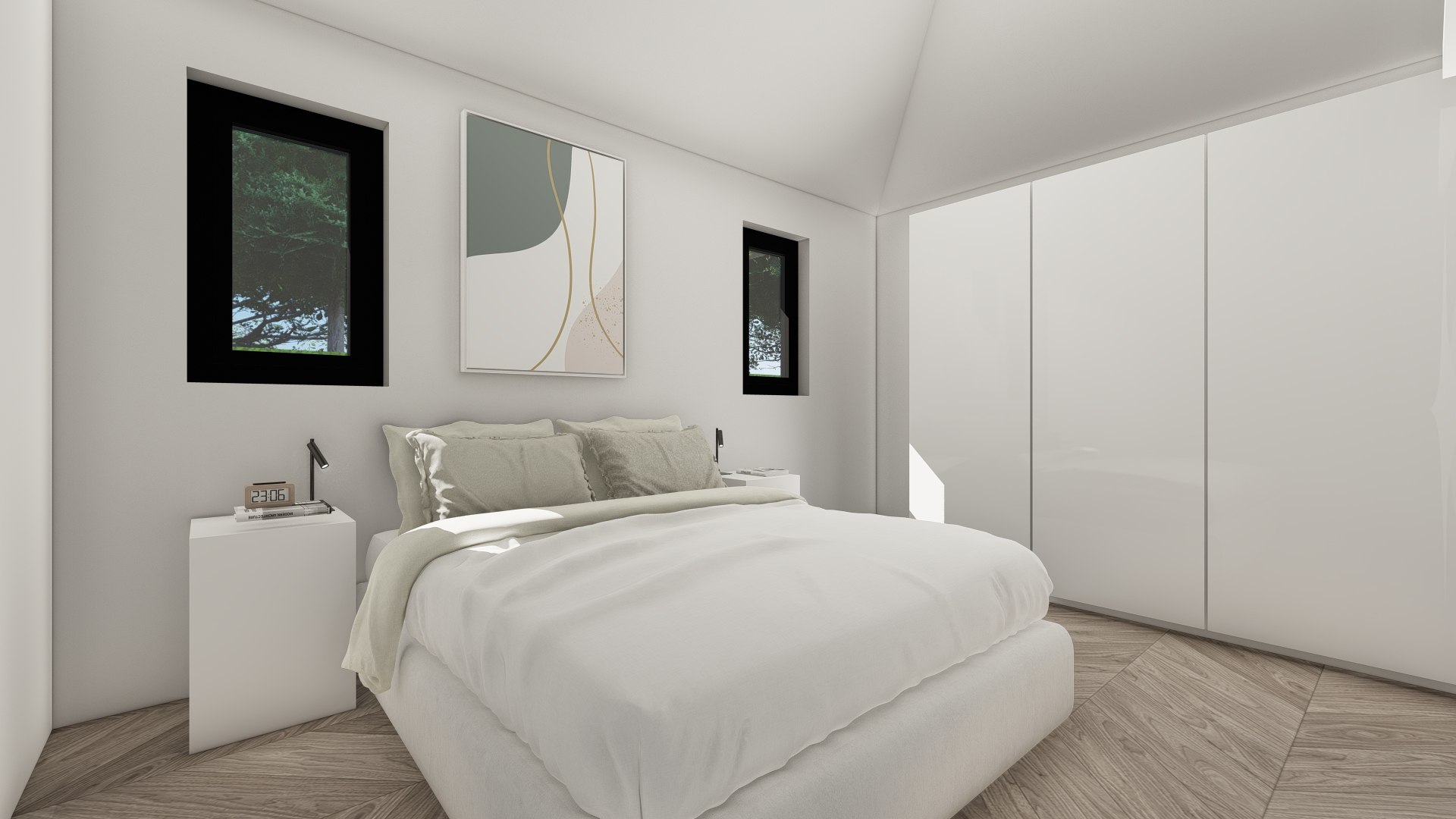 Bedden en matrassen, kasten en nachtkastjes met bed ombouw en verlichting, 3D beglazing, extra isolatiepakket (winterhard vloer, wand en dak), vloerverwarming, airco.