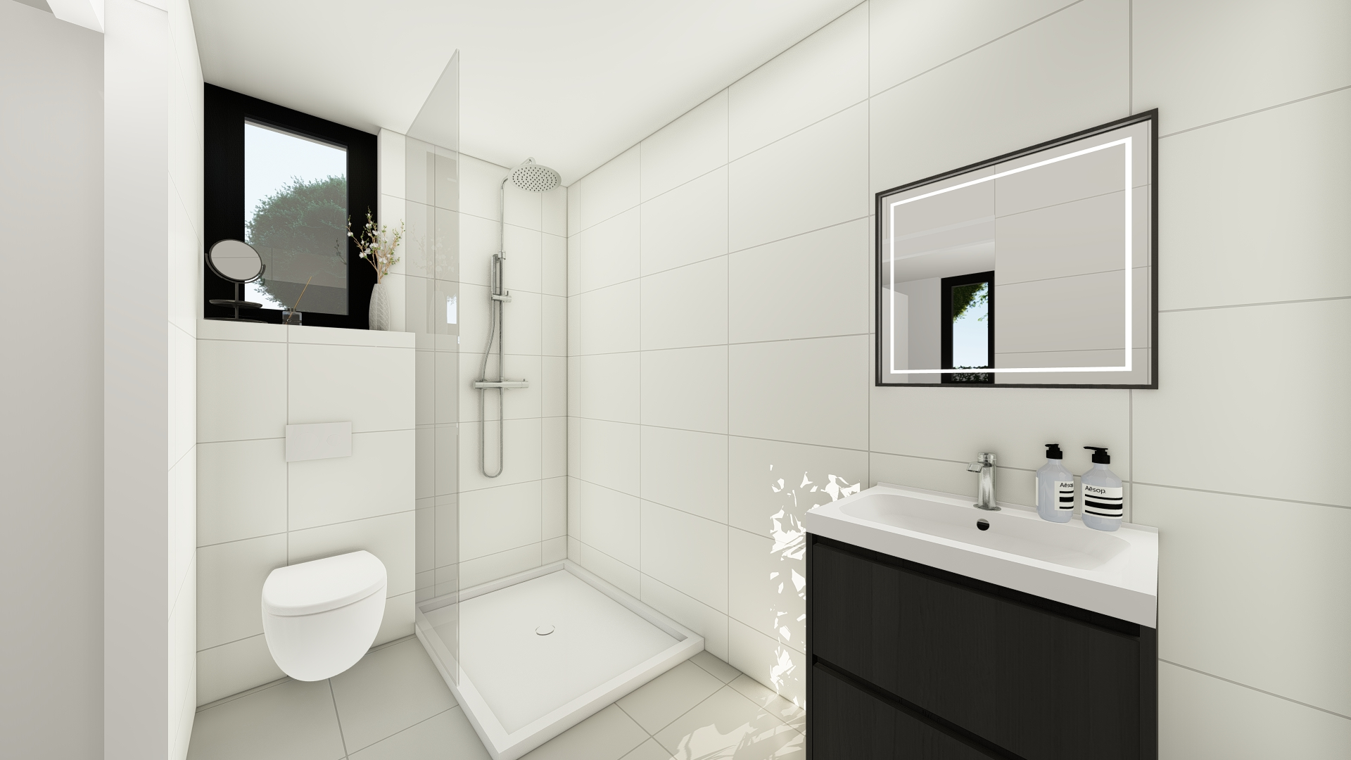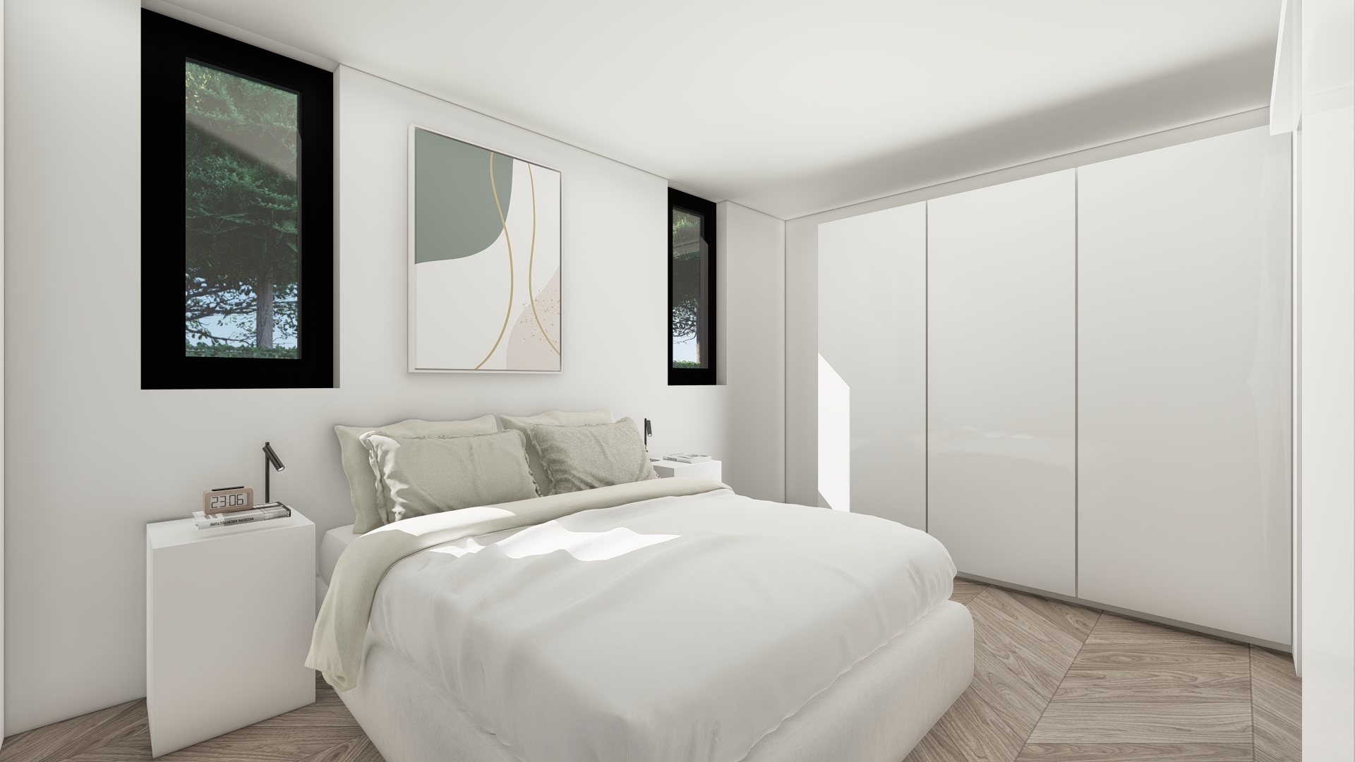 Bedden en matrassen, kasten en nachtkastjes met bed ombouw en verlichting, 3D beglazing, extra isolatiepakket (winterhard vloer, wand en dak), vloerverwarming, airco.